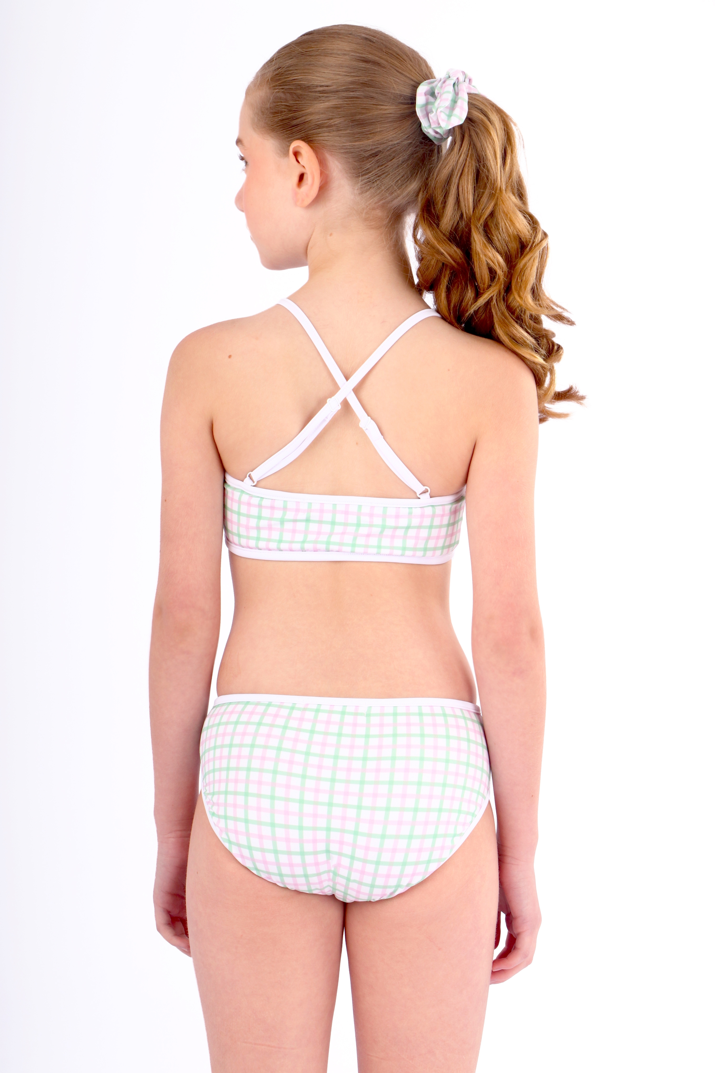 O charme do vichy com o conforto que as crianças merecem! O biquíni Sophie Vichy tem tons de verde e rosa. Alças reguláveis, viés branco e muita leveza para acompanhar os dias mais ensolarados.
