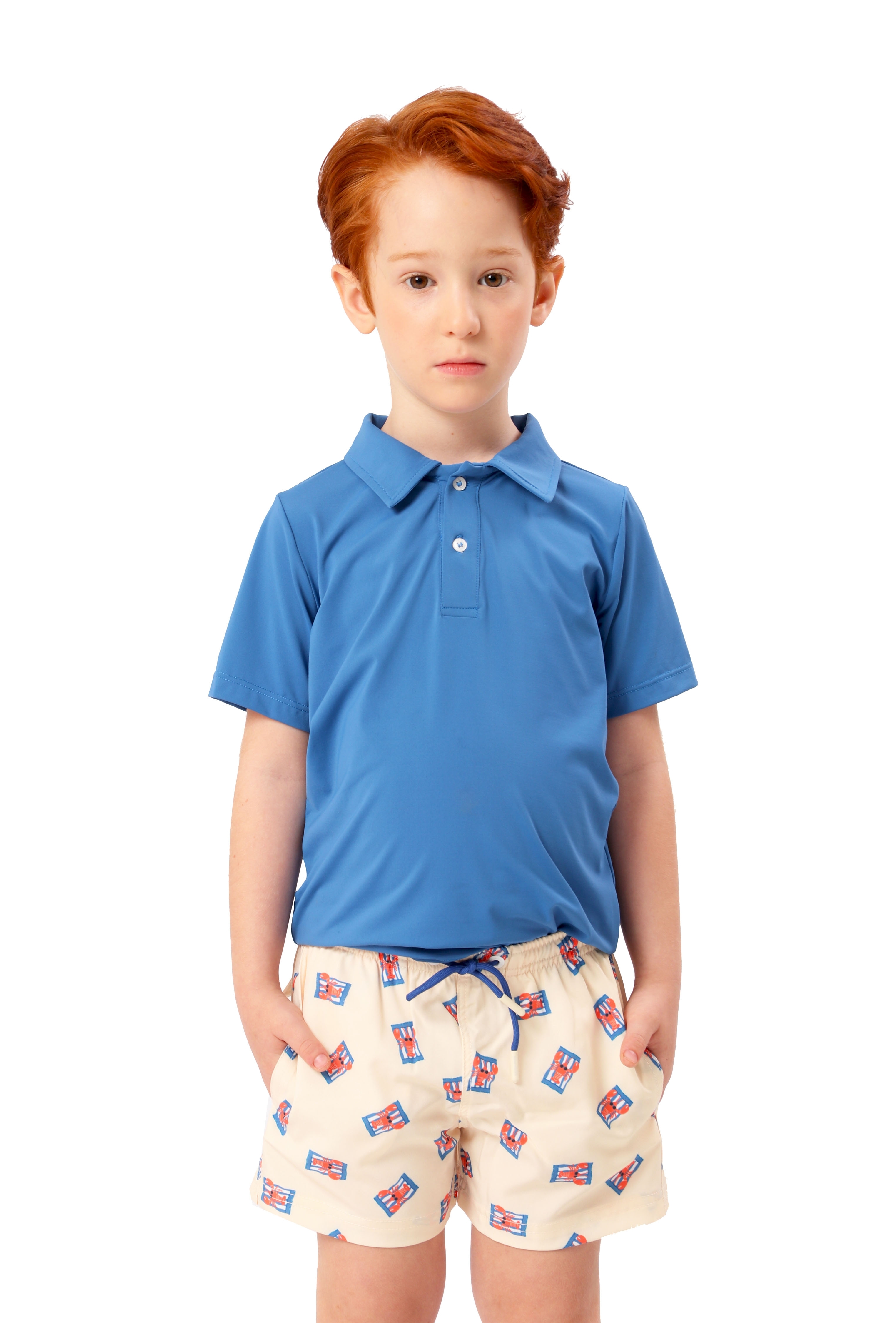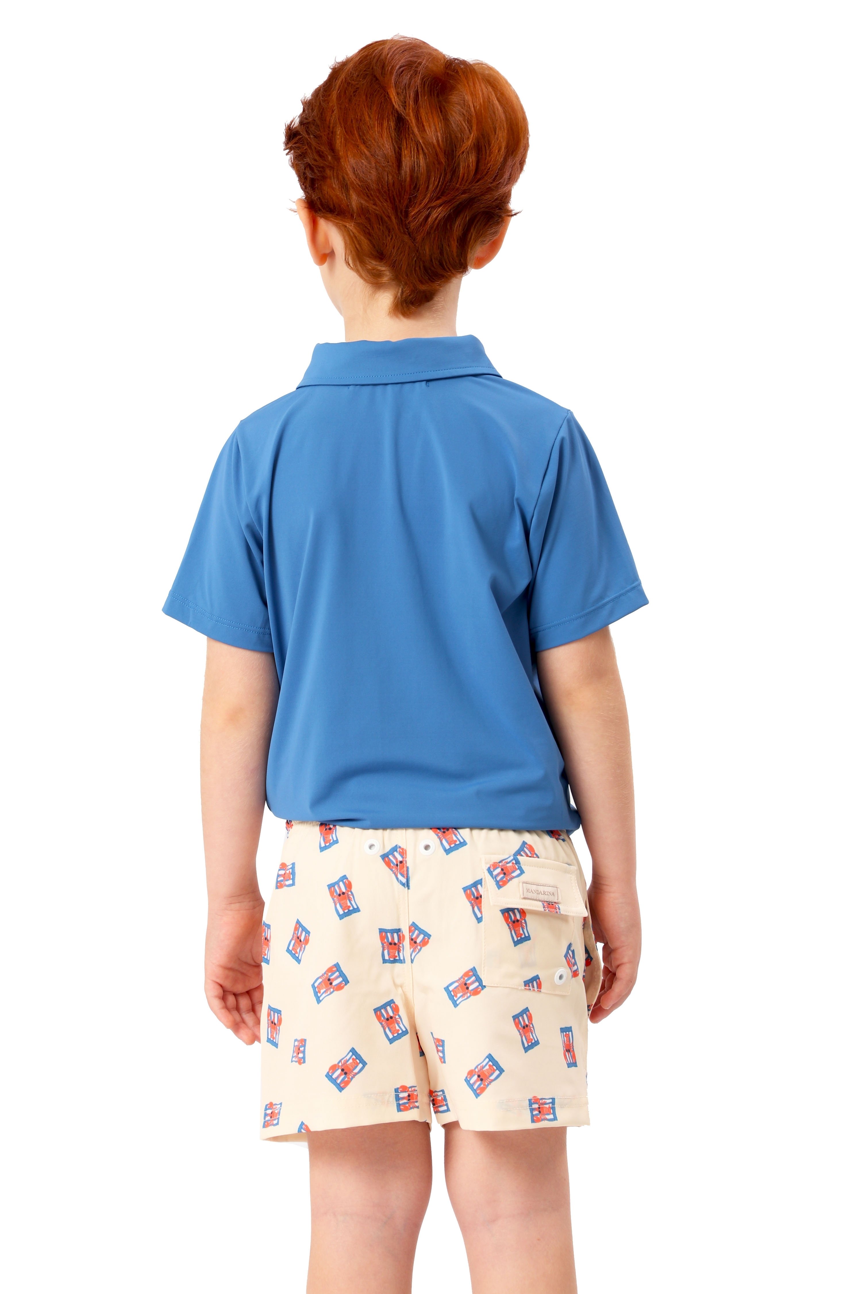 Camiseta Pólo Infantil UV Azul Celeste, clássica com um toque Mandarina! Nossa camiseta pólo UV é feita de lycra com proteção UV 50 e tem gola polo com botões personalizados. Confortável e versátil, ela vai do parque à praia com leveza e sofisticação.
