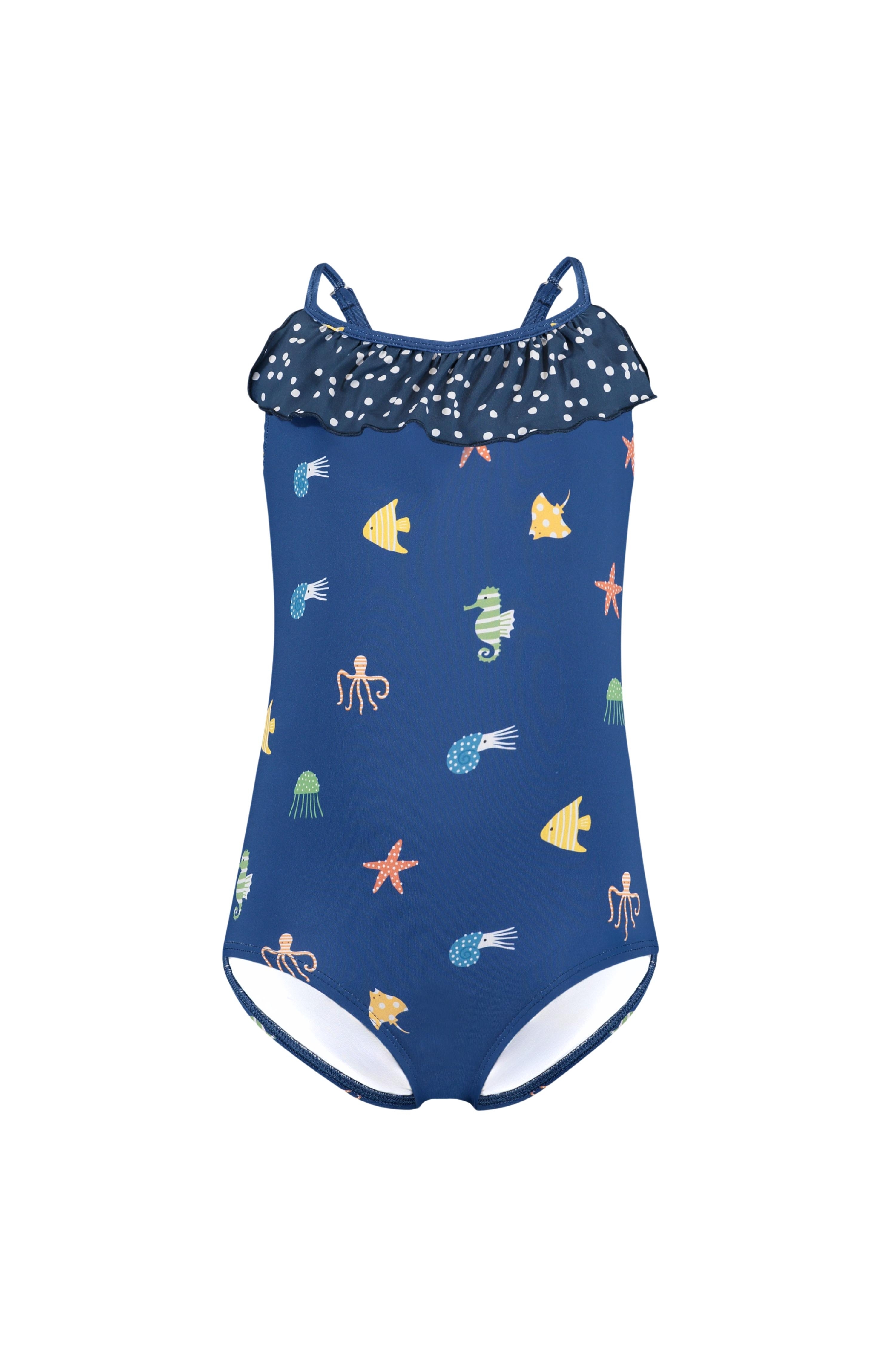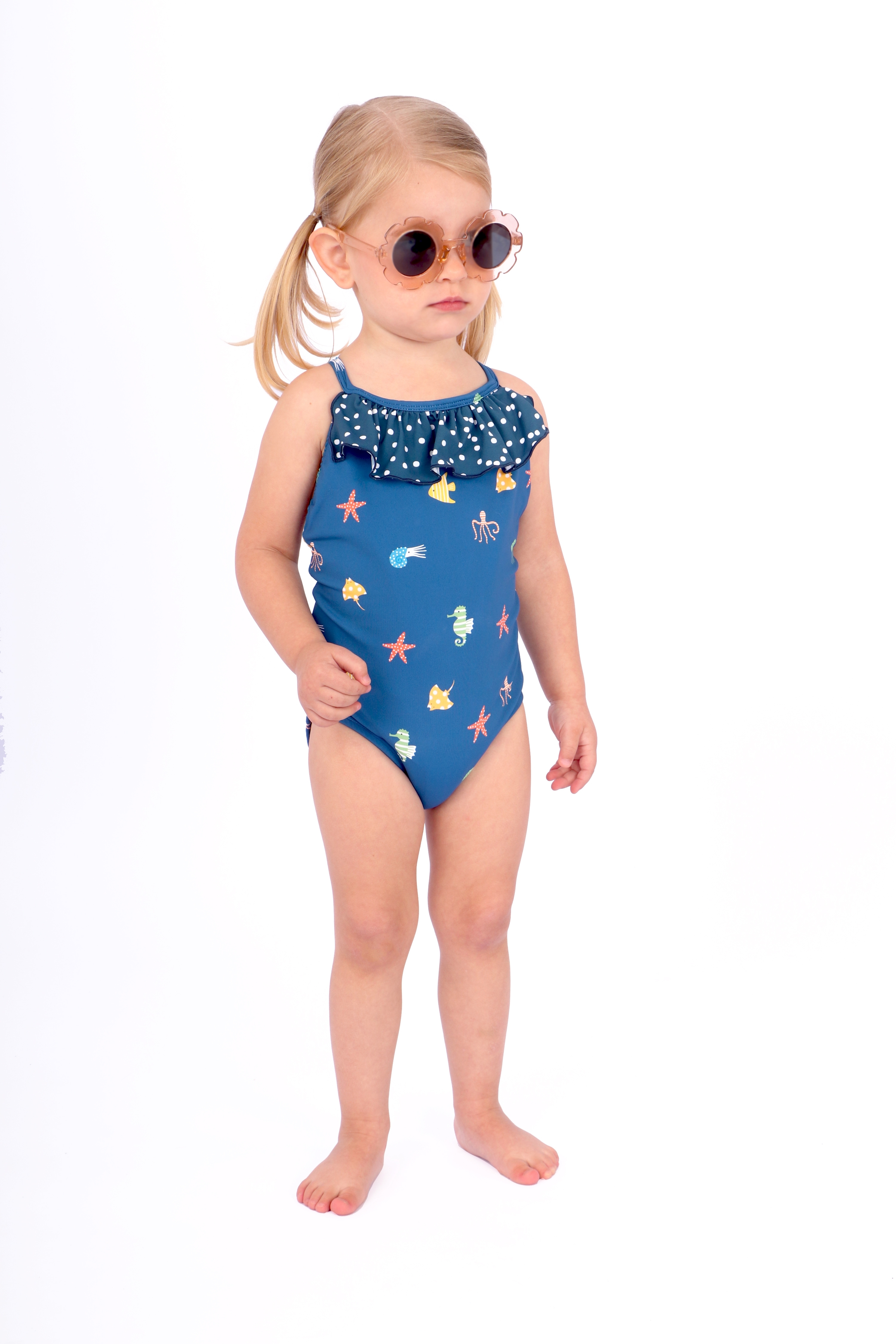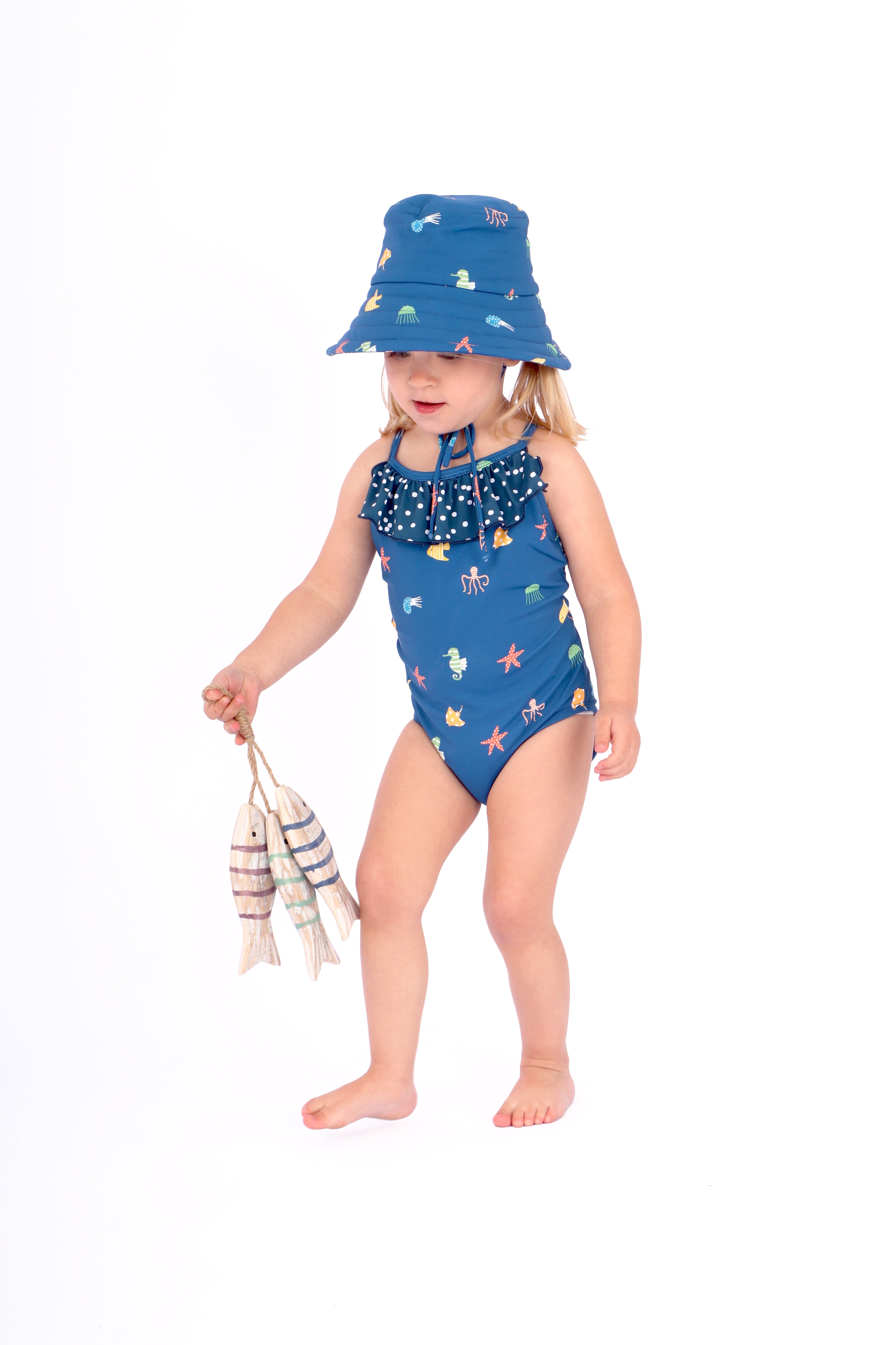O Maiô Heloise traz estampa de bichinhos marinhos sobre fundo azul, com babado no decote e alças reguláveis. Um modelo encantador, cheio de movimento e conforto para dias de sol e água fresca.