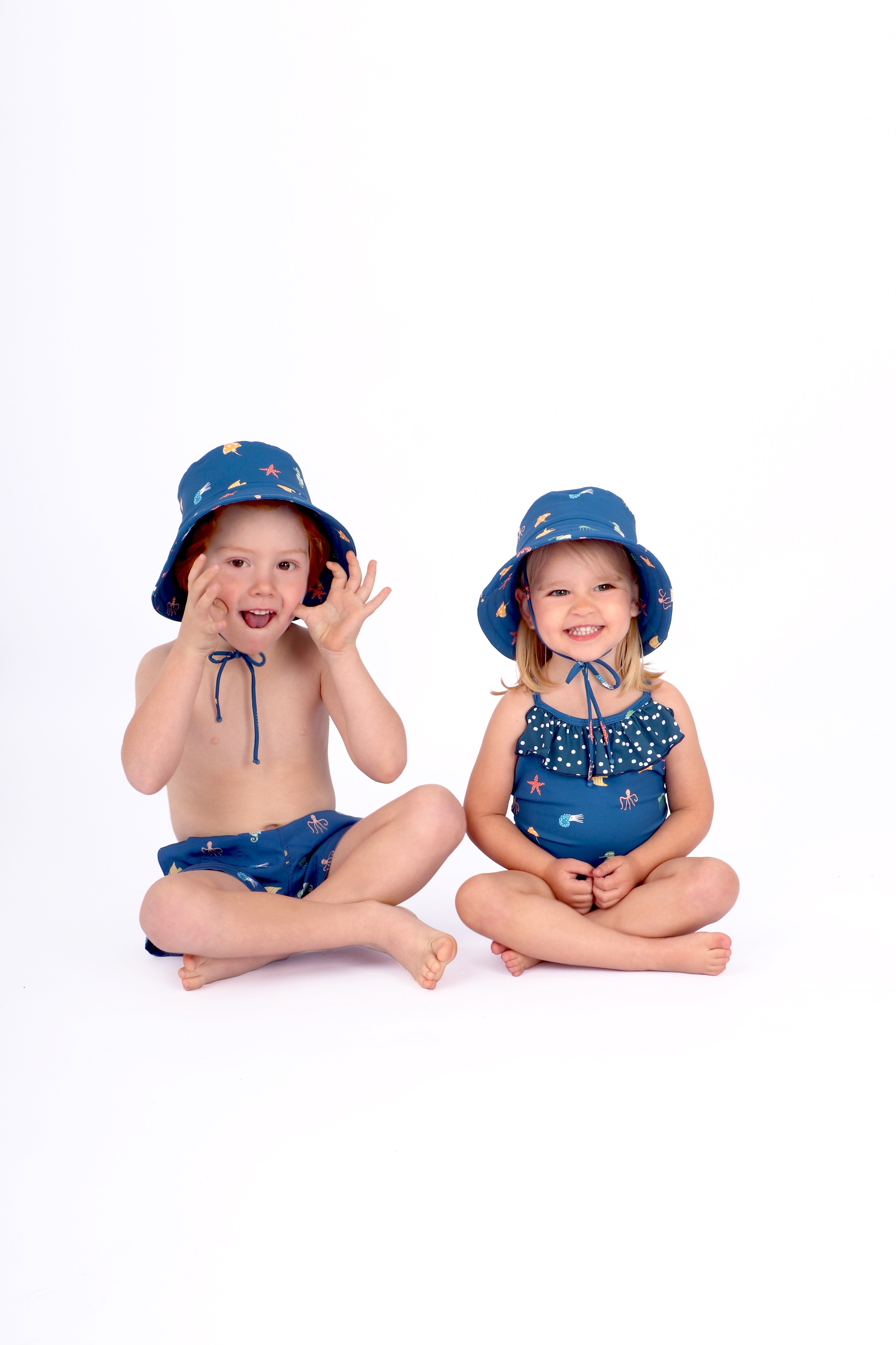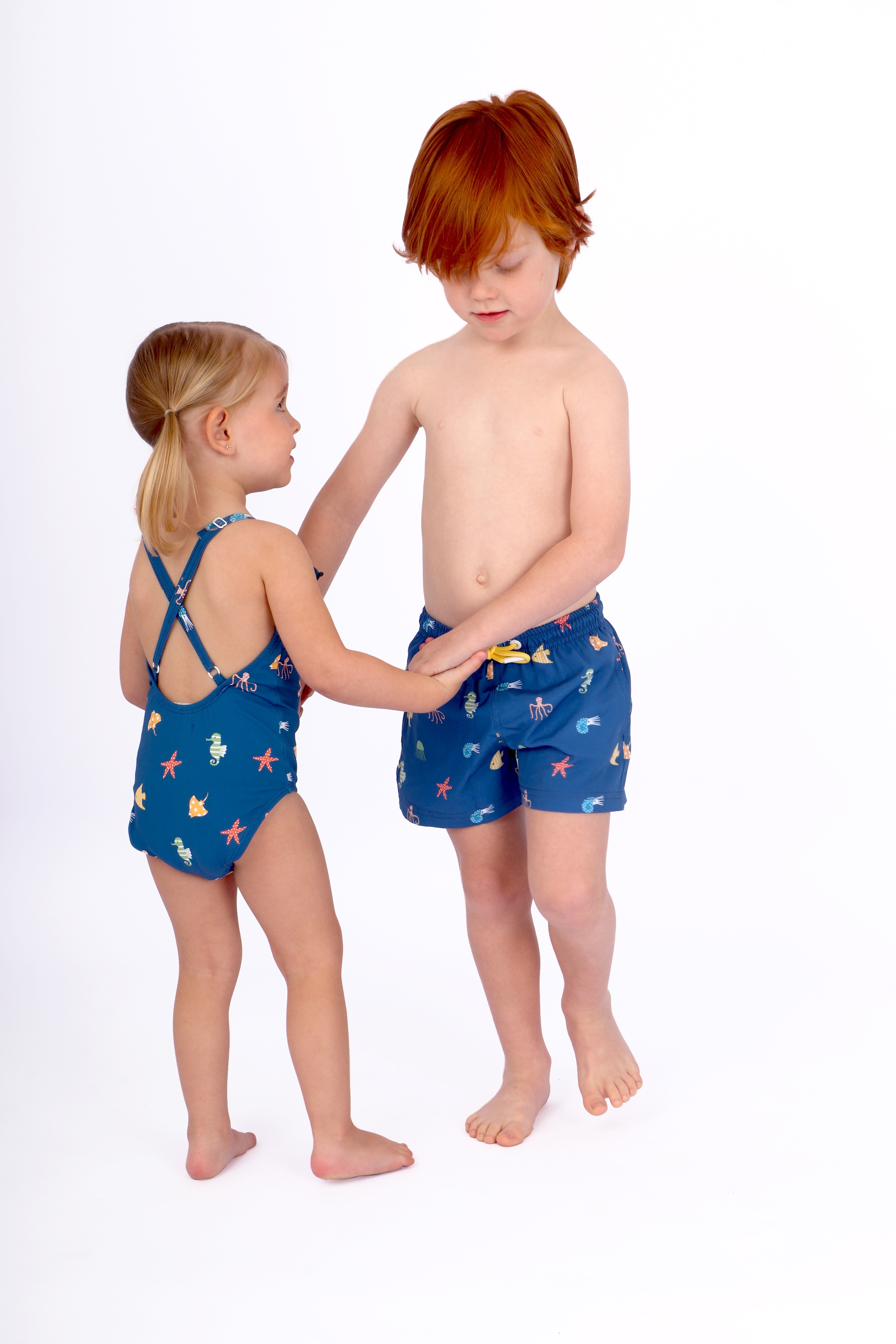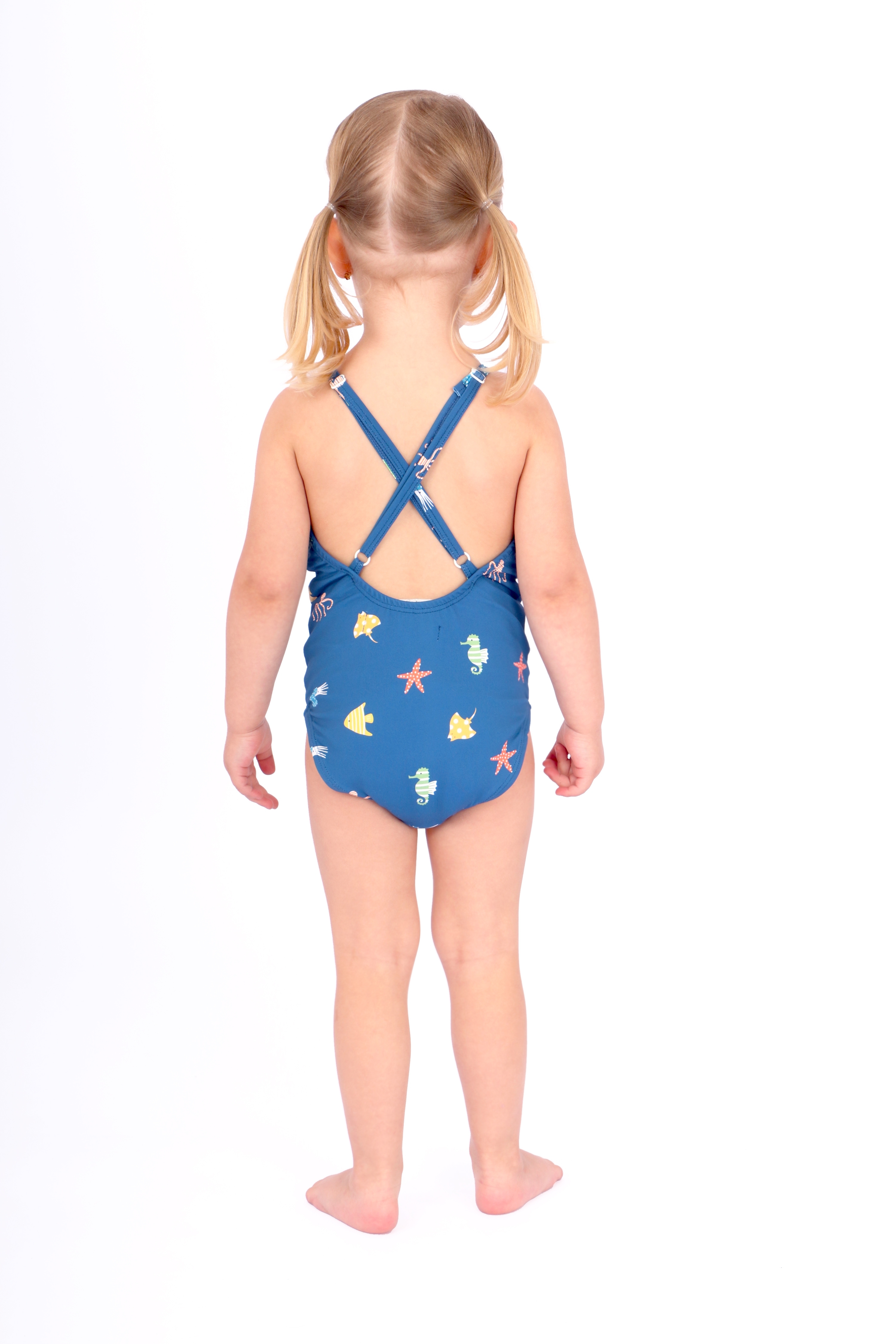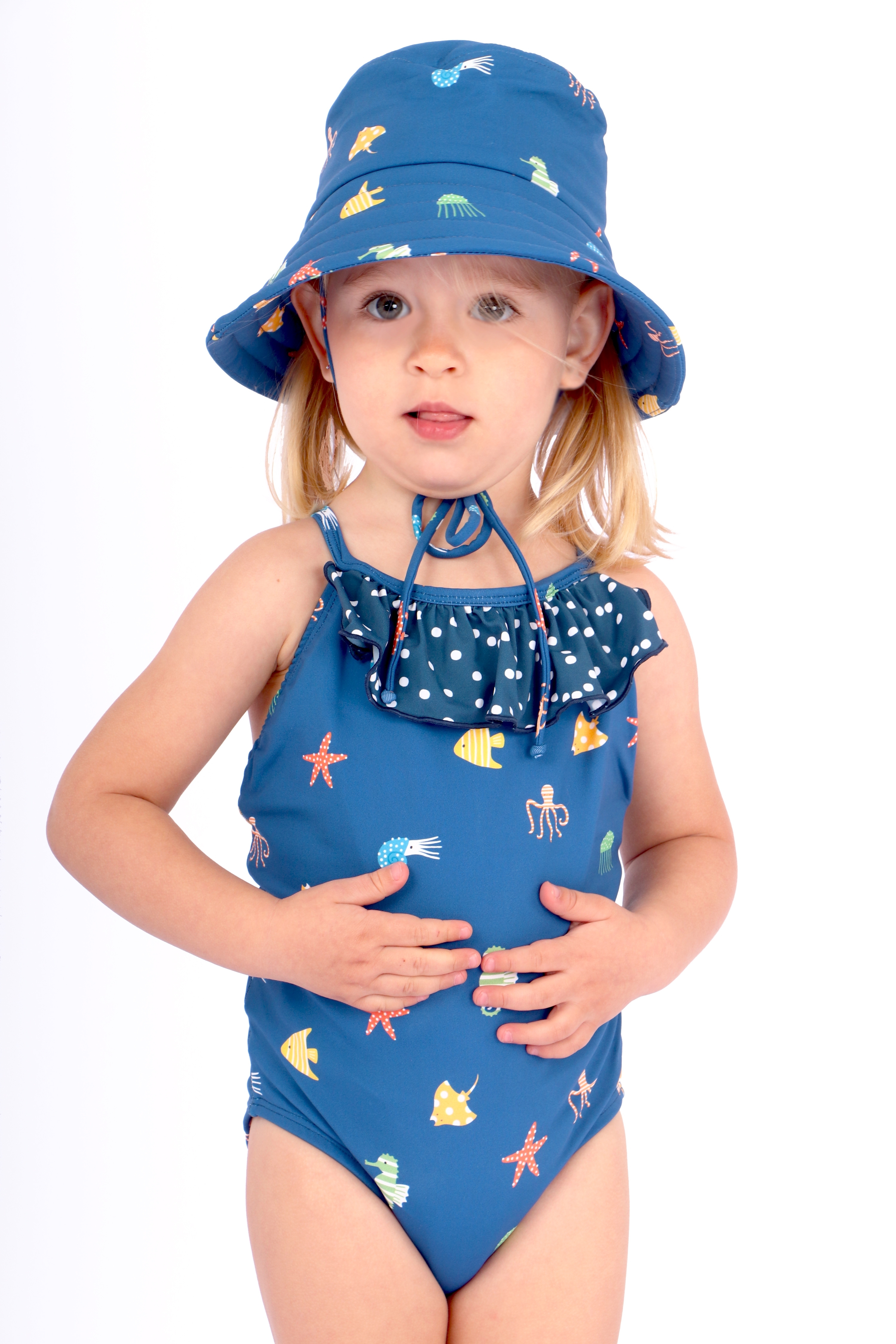 O Maiô Heloise traz estampa de bichinhos marinhos sobre fundo azul, com babado no decote e alças reguláveis. Um modelo encantador, cheio de movimento e conforto para dias de sol e água fresca.
