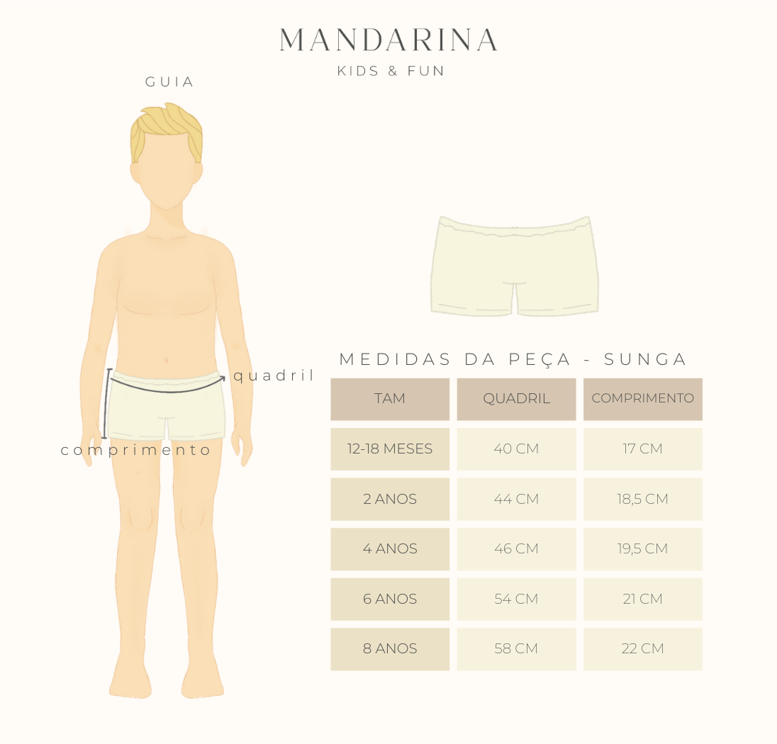 Para mergulhos, brincadeiras e muito estilo. Com modelagem confortável, elástico no quadril, regulagem e estampa exclusiva Mandarina. Feita em Lycra, ela conta com proteção UV 50, bloqueando os raios UVA e UVB. Forro 100% poliamida para trazer mais conforto e qualidade.